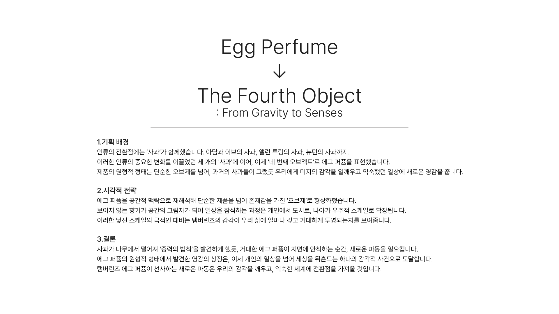 Throughout history, the "Apple" has stood at the turning points of humanity—from Adam and Eve and Alan Turing to Isaac Newton. Following these three iconic apples that reshaped our world, we introduce the "Fourth Object": the Egg Perfume. Its archetypal form transcends being a mere object; like the apples of the past, it awakens dormant senses and injects fresh inspiration into our familiar routines.